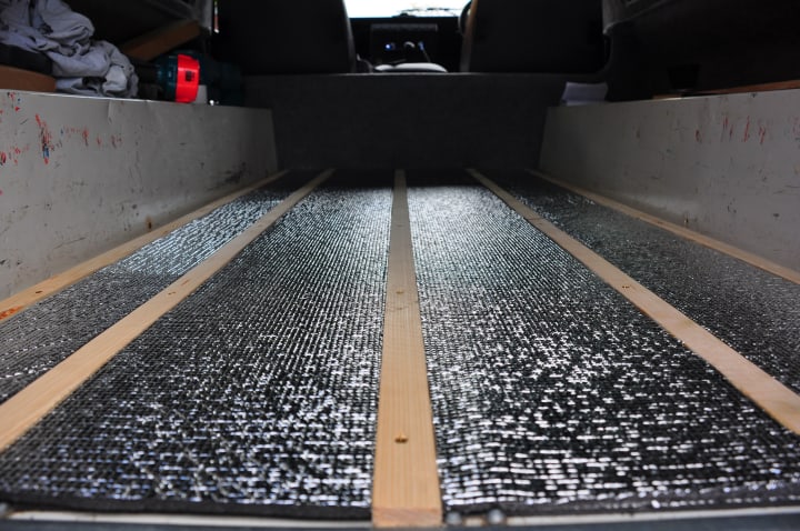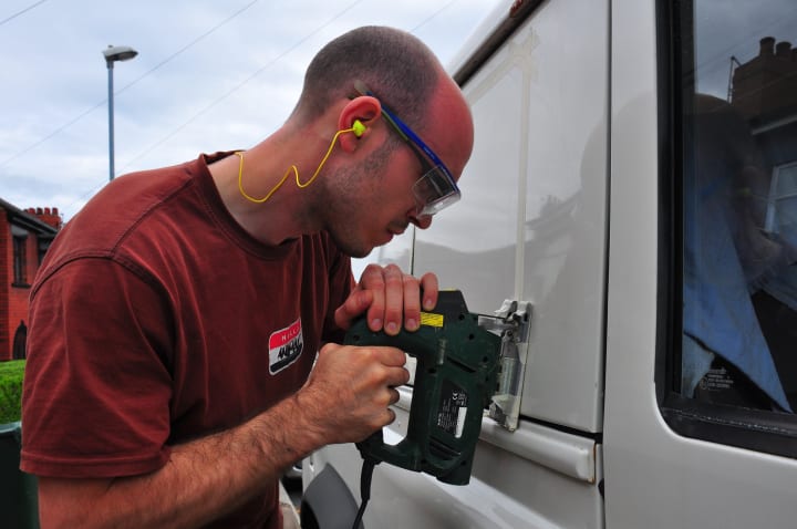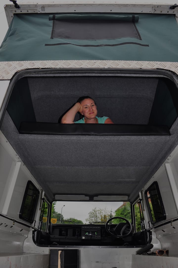 We scrubbed him spotless and eradicated that smell. We insulated and soundproofed every surface, boarded over that proofing and then carpeted over the boarding. We ran all the electrics and hooked the wires up to various appliances — a fridge, plug sockets, a water pump, a fan, and lighting. We fitted cupboards and drawers, a sink with a tap, a burner, a 36-litre water tank, a diesel heater, a roof light, extra windows in the back seating area and upholstery, curtains, and the pièce-de-resistance: a pop-top roof with tented sides and a fold-out bed. Apart from a toilet (which we couldn’t figure out how or where to fit one), Hugo had it all. Well almost… The only way to get air conditioning was to wind down the windows or open the ventilation flaps at the front.