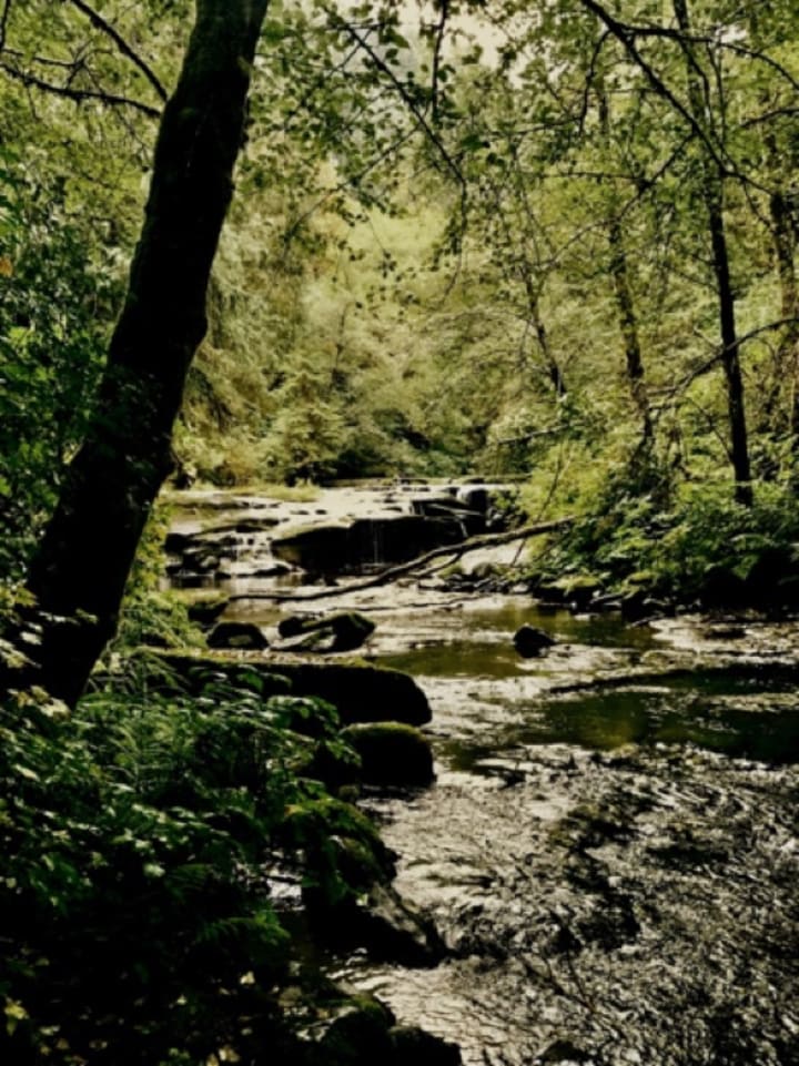 Near beautiful streams where it feels appropriate to lay down your burdens. The path through the forest led to more babbling brooks: