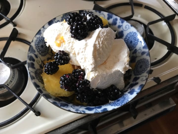I also prepared amazing sweet things, with fresh picked blackberries, sweet cream, and pound cake. But I would learn to stuff peppers, prepare chicken corn chowder, and seared cod.