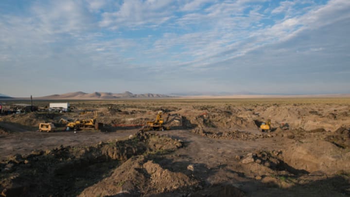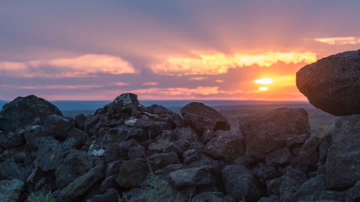 The setting sun casts orange rays above basalt boulders at the edge of the Dust Devil mine in southeast Oregon’s high desert. The mine is one of the region’s more important commercial sunstone sources.