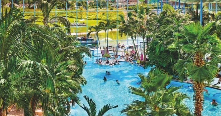 Badeparadies Schwarzwald is a water park with themed saunas, a spa, waterslides, and eighteen pools surrounded by palm trees.