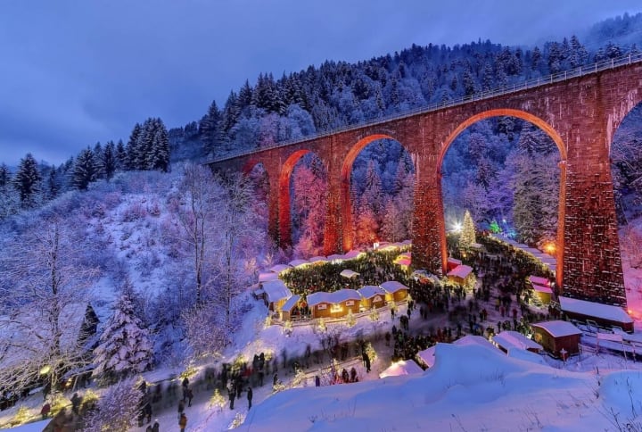 In December for four weekends, the steep hillside beneath the viaduct’s stone arches becomes the site for the Ravenna Gorge Christmas Market.