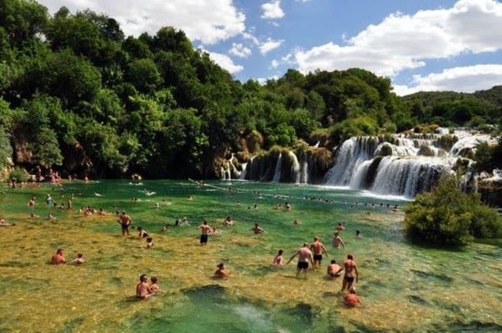 The upper area of the waterfalls is heavily wooded with many willows, cypress, hornbeam, poplar, and oak trees. Around Krka River, there is a beach and people enjoy swimming in the summertime. An area beyond the bridge is where local women sell dried or fresh figs, almonds, olive oil, grape brandy and herb brandy.