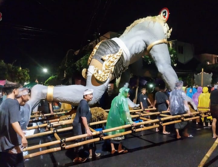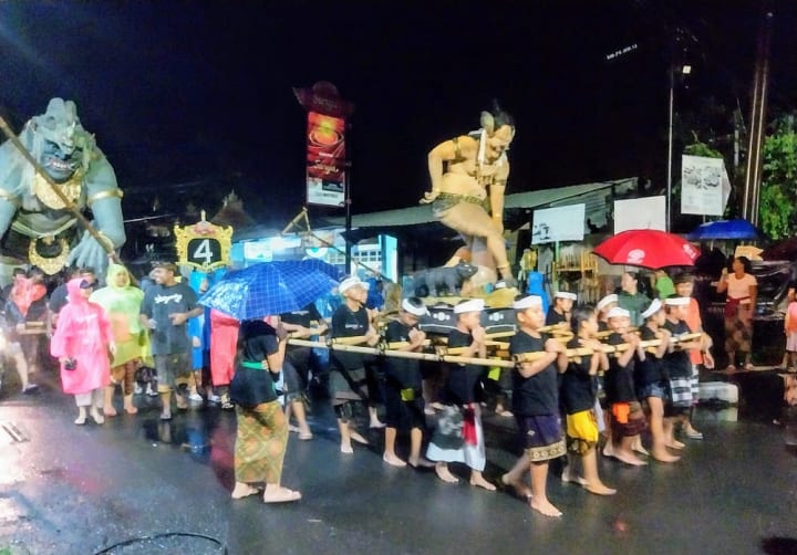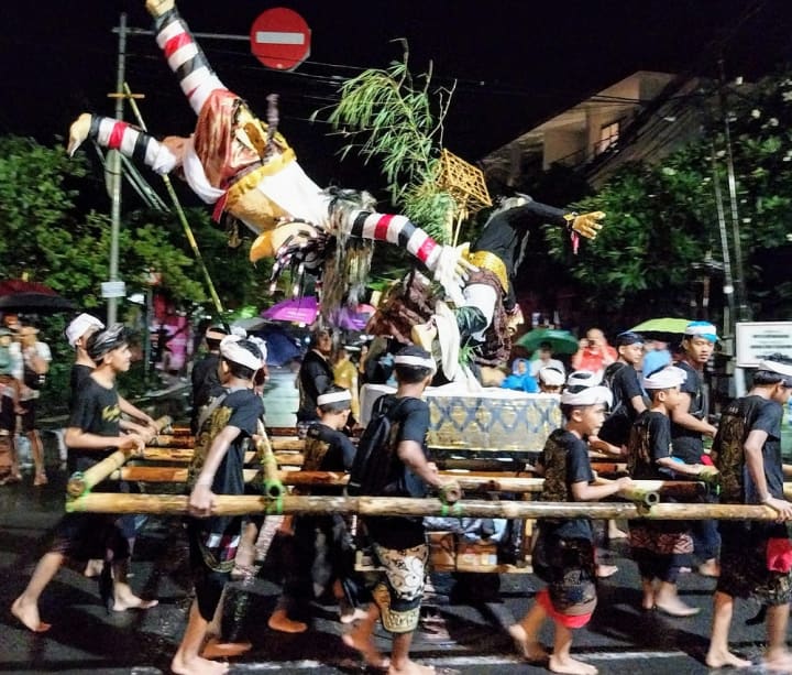 Men or young boys, primarily barefoot and garbed in traditional Balinese costumes of sarongs and udeng head scarves, carry the ogoh-ogoh on huge bamboo platforms.