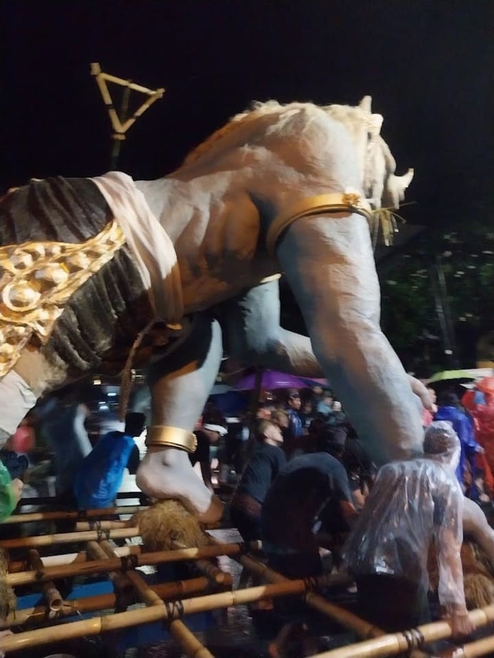 The procession of gigantic creatures is energetically accompanied by voracious drumming and lit torches. Often, the platforms are ceremoniously twirled, shaken, rattled, or rotated as part of the ritual to thwart evil. It's a delightful, romping spectacle!