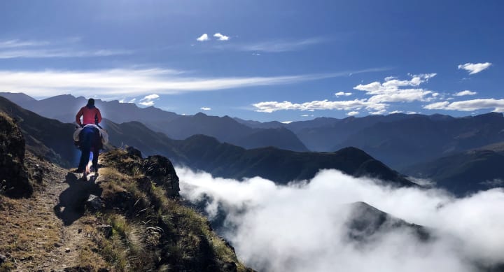 A man, a horse, a path, another day, another meal, the sun, mountains, sleep, dogs barking, a sip of wine, sunrise in the Andes.