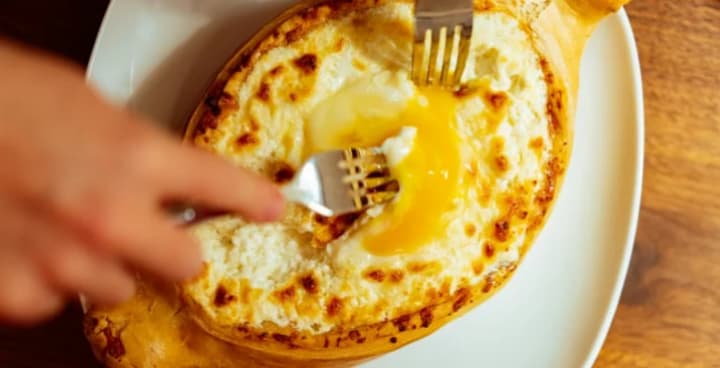 Khachapuri is another iconic Georgian dish. This savory bread is filled with a rich cheese filling and comes in several variations. The most famous is Adjarian Khachapuri: a boat-shaped bread filled with cheese, butter, and an egg yolk that you mix in yourself. A real treat for cheese lovers! It’s usually served in restaurants and hard to find in bakeries. Originally, all the different versions come from various regions of Georgia. Over time, many variations have become widely available in bakeries and restaurants.