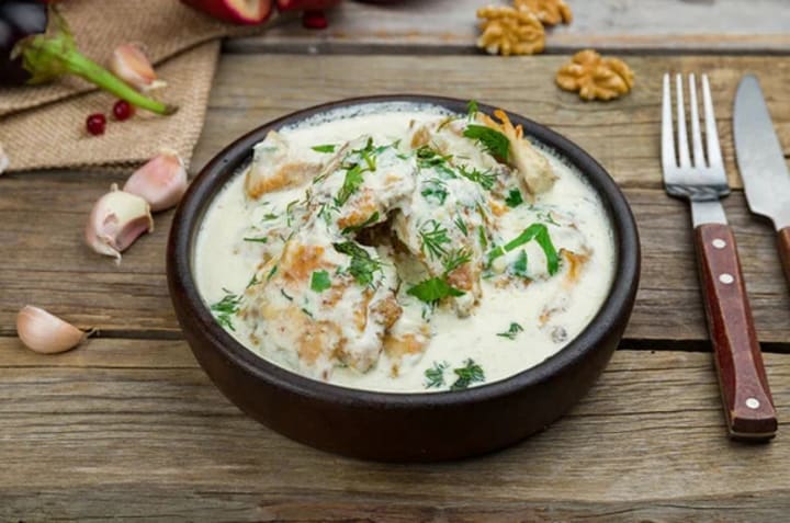 Chkmeruli, a dish from the Racha region, is typically meant for two people. It consists of a whole roasted chicken drenched in a creamy garlic milk sauce. The combination of butter, milk, and lots of garlic makes this dish irresistible. Nowadays, it’s often served in restaurants as a dish for one, with half a chicken. While not available everywhere, a little searching will lead you to this tasty dish.