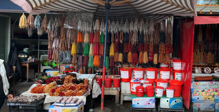 Speaking of snacks, Churchkhela looks like a colorful candle but is actually a nutritious candy made from walnuts strung together and dipped in thickened grape juice. It’s a popular snack and a perfect energy boost for travelers and hikers. You can find it almost everywhere, but for the best quality, look for it at a local market.
