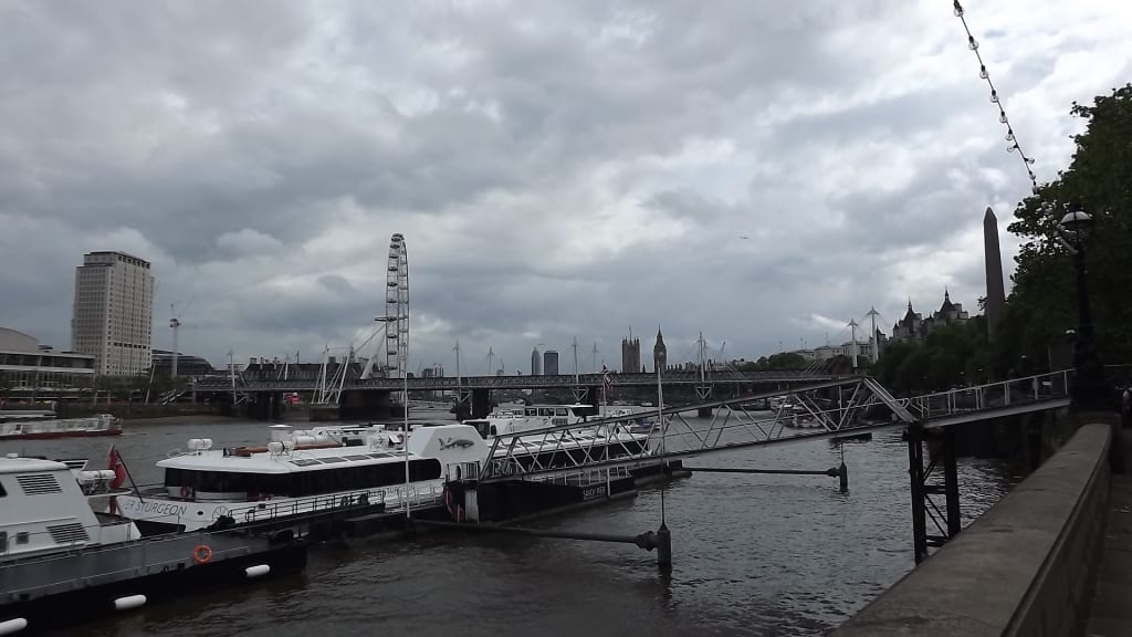 If starting the walk from Westminster Bridge, you will have the Palace of Westminster, with the Big Ben clock tower, right behind you. Immediately on the right is Westminster Millennium Pier, from which riverbus services operate to other piers along the Thames, as do pleasure cruises run by several commercial operators.