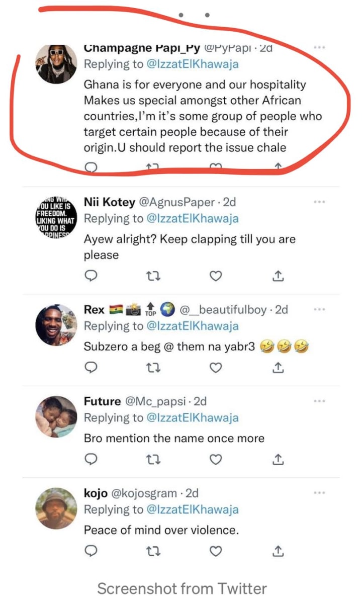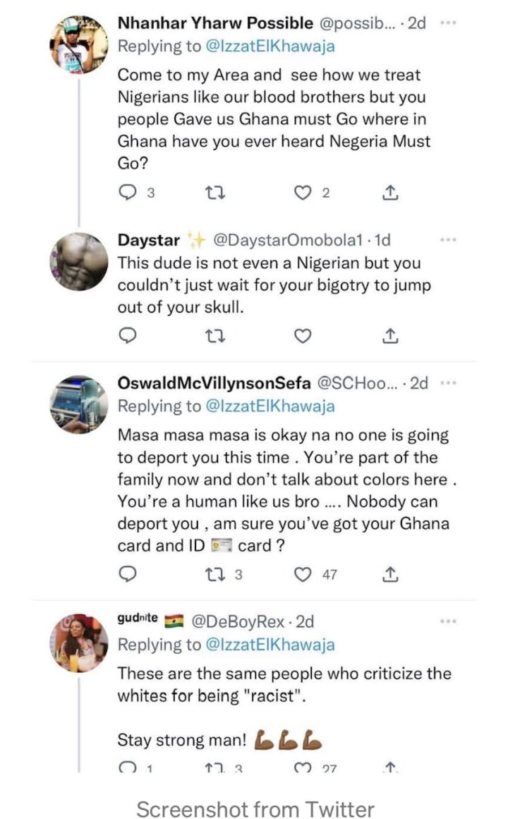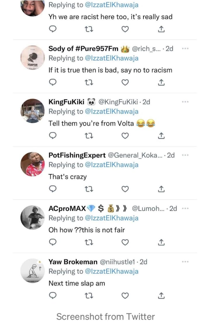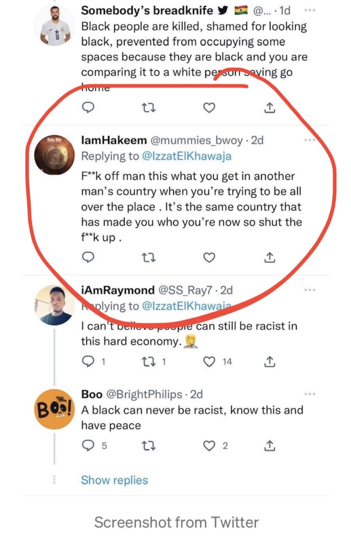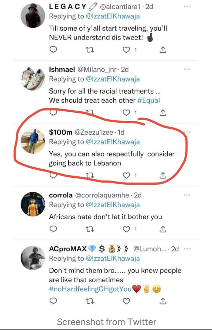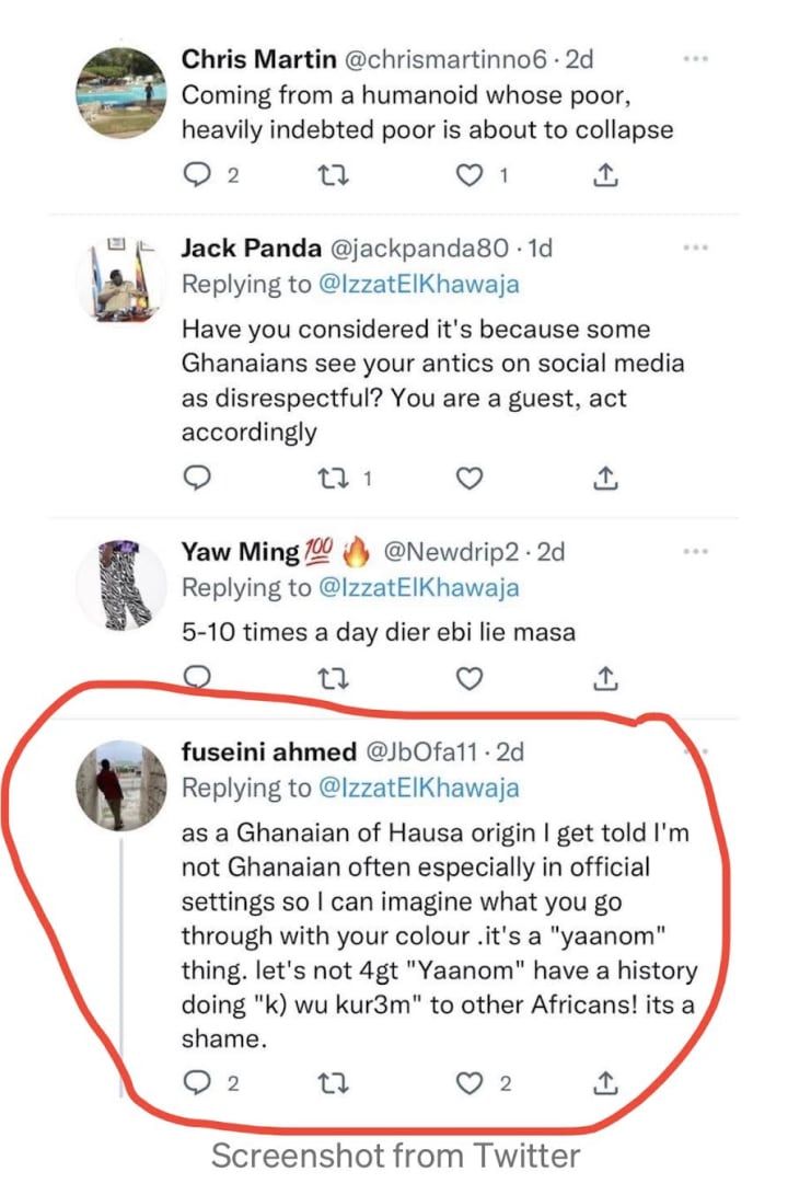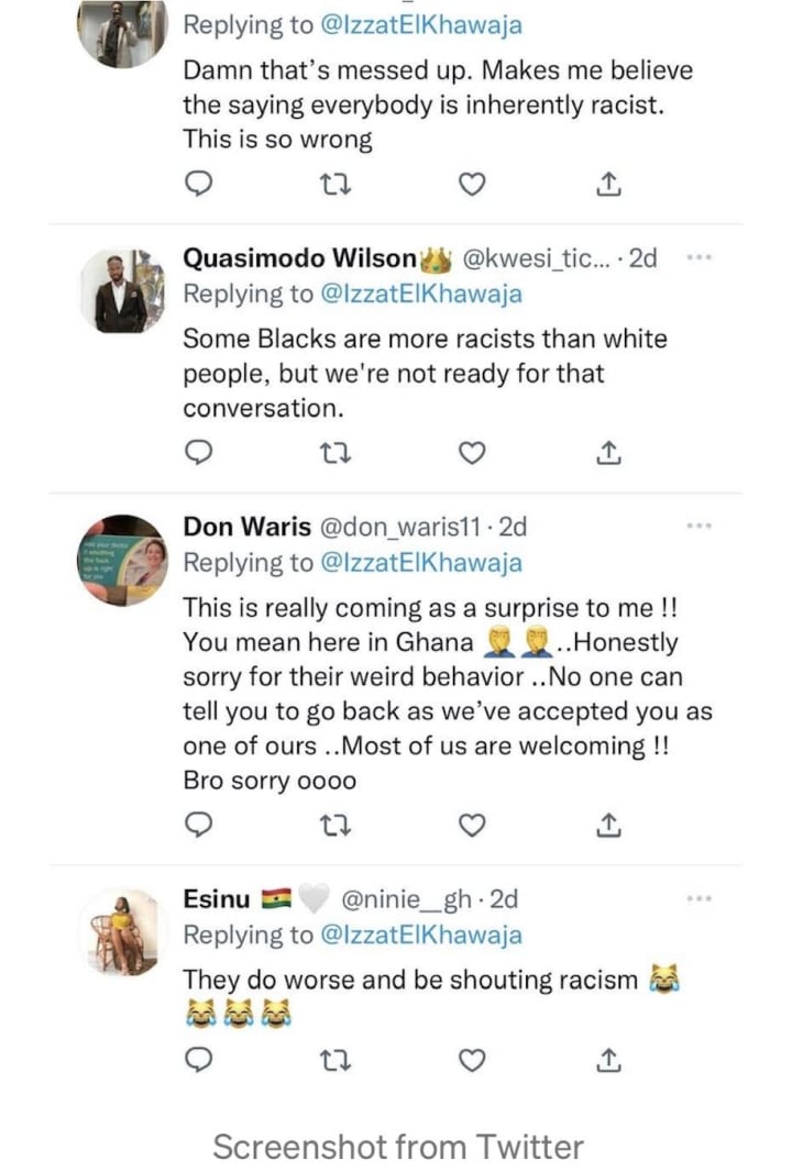 Ghanians on Twitter replied to a Lebanese man Tweeting that he's bothered everyday in Ghana because of his skin color. He's told everyday 5 to 10 a day to go back to his country, his Tweet gained over 10 thousand replies, I was one of them.