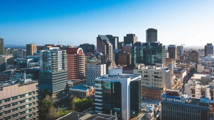 Adelaide city is surrounded by green parkland, the Mount Lofty Ranges, coastal beaches, historic buildings, wide streets, various street cafes, and restaurants.