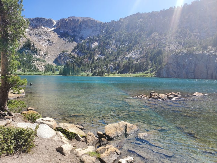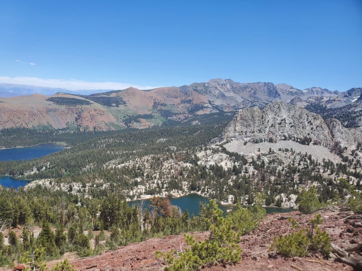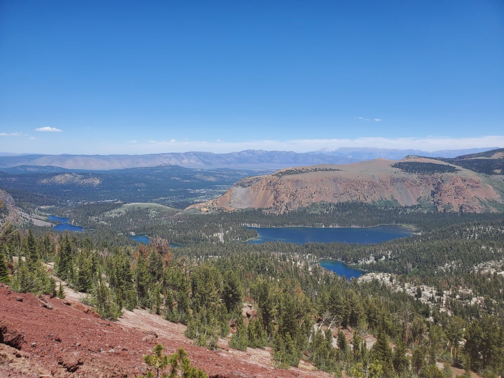 Red Cones Trail starts from Horseshoe Lake. This trail goes past McCloud Lake and over the relatively gentle Mammoth Pass. Several trail junctions offer options to access the John Muir trail near Crater Meadow or Reds Meadow. The picture below and the cover picture for this article are from the summit of Red Cones Trail. As you hike back down there are lakes to swim in and relax.