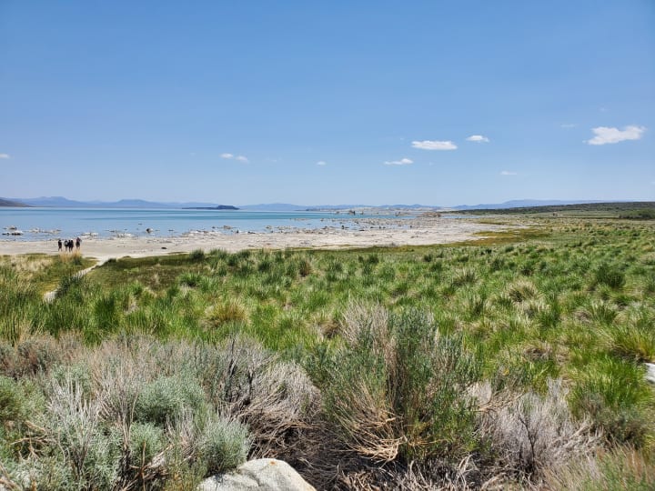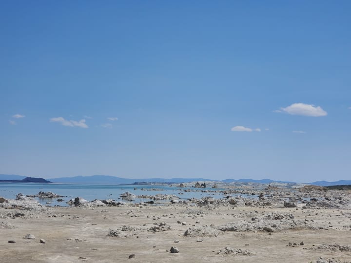 I drove south to Mono Lake (pronounced moe-no instead of mono the infectious disease) from Tahoe in June 2021. The vast body of water brightens the drive immediately. I found a 12 car pay parking lot, wheelchair accessible, and walked out toward the volcanic earth surrounding the water. The feeling of "other planetary exploration" is found as one walks the beach. I was spoiled with the fact that only one other person was on the beach. These moments almost alone with nature, are thrilling to behold.