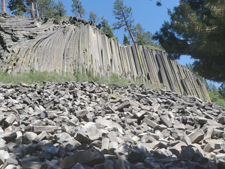 Devils Postpile National Monument is a one-mile walk, along the same route to Rainbow Falls! Devils Postpile is made up of thousands of hexagonal basalt columns formed 100,000 years ago when lava flow slowed and then cooled and cracked. You can view Devils Postpile from the base and hike up to the top, where you can view the hexagonal shape up close. The hexagonal pattern atop makes one think of a sci-fi film in which the pattern is a map for extraterrestrial visitors.