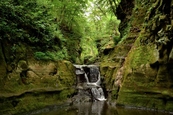Pewit’s Nest is a 30 – 40 foot gorge with cascading waterfalls and amazing rock formations. Within and above the gorge is forest dominated by red cedar, white pine, hemlock, and yellow birch. The Pewit’s Nest Natural Area is in Baraboo.