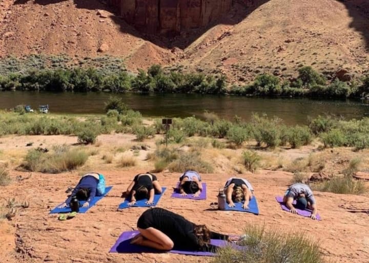 Meandering along the way through these massive canyon walls is spectacular. Along the way, you stop off to look at ancient petroglyphs. Once you reach the bend, then it’s time for your Yoga class on the bend! What a unique place to practice Yoga — it’s a setting you are unlikely to do such a class in again.