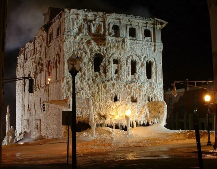 Though it survived Urban Renewal, pictured here are the icy remains of Bangor's Masonic Temple, January 2004. Tragic, yes, but it's also one hell of a photo. Photo credit: Jeff Kirlin