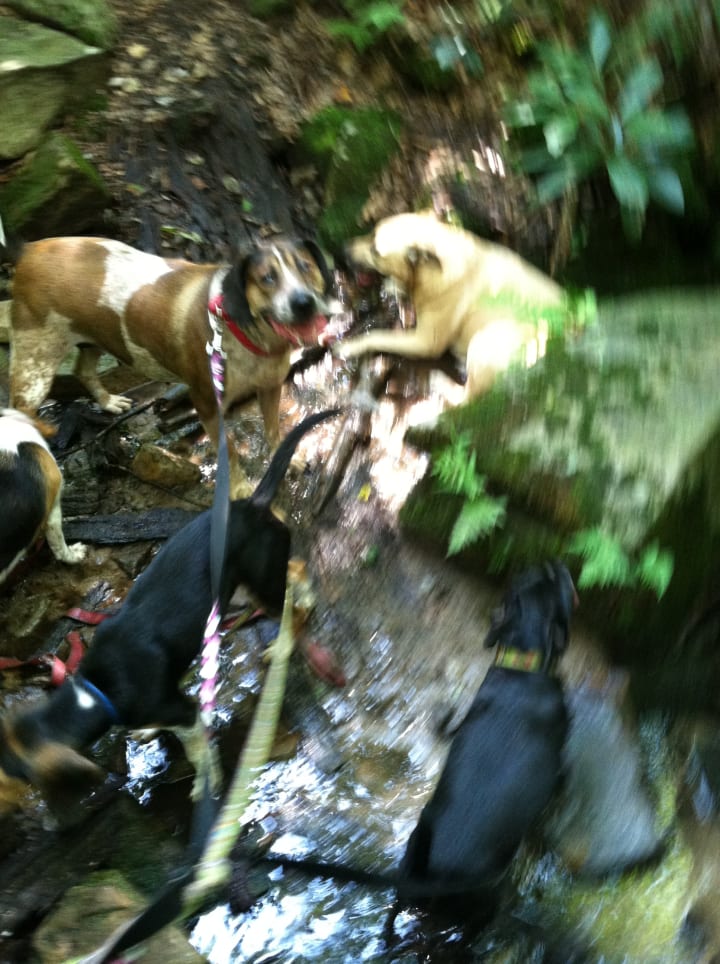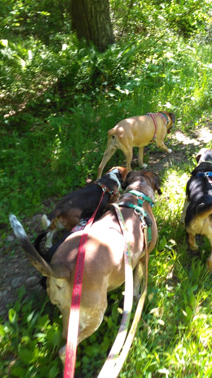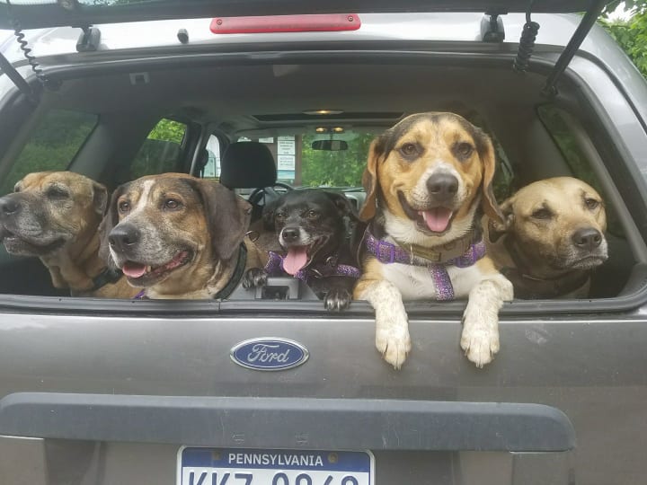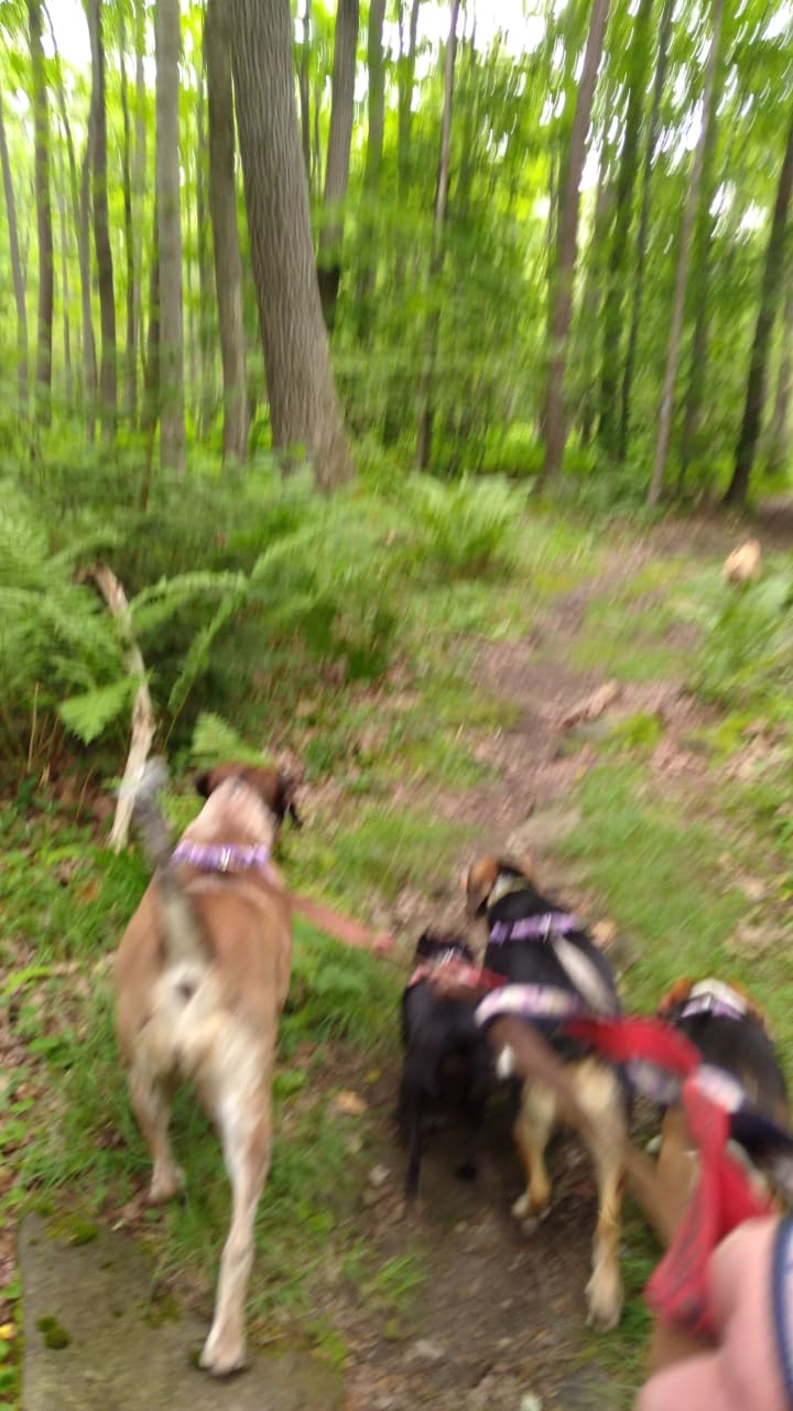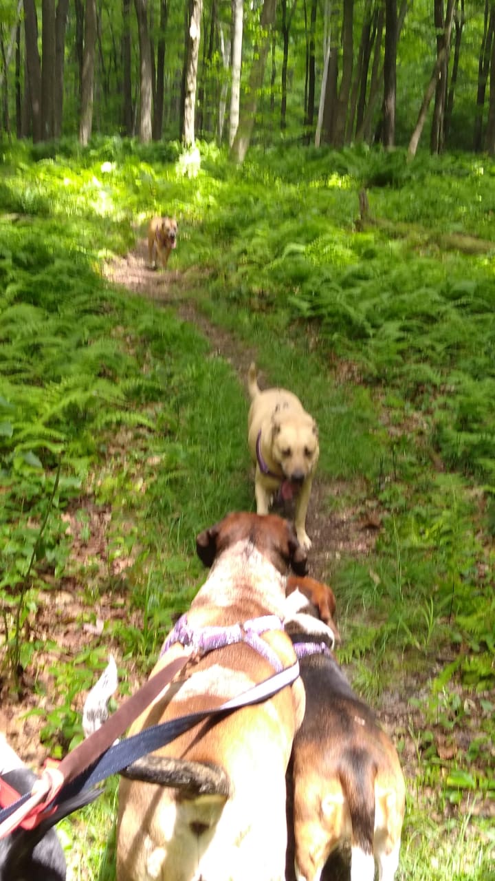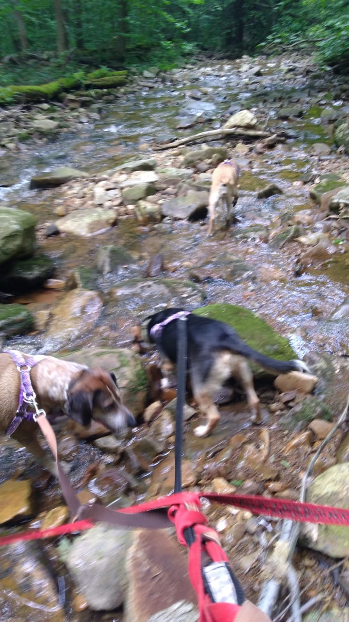 A little about me and my pack. I am a proud mom of five beautiful pups: Cocoa, a 14-year-old boxer mix, Emma, a 10-year-old pit mix, Molly, a six-year-old red tick coon hound, a four-year-old chi-beagle mix named Lil Kimmy and a one and a half-year-old blue tick beagle mix named Rocky. Our adventures usually occur around water features. It is solely to cater to the dogs body temperature. The average temperature for the forestry of Western Pennsylvania in which we hike averages 75 degrees.