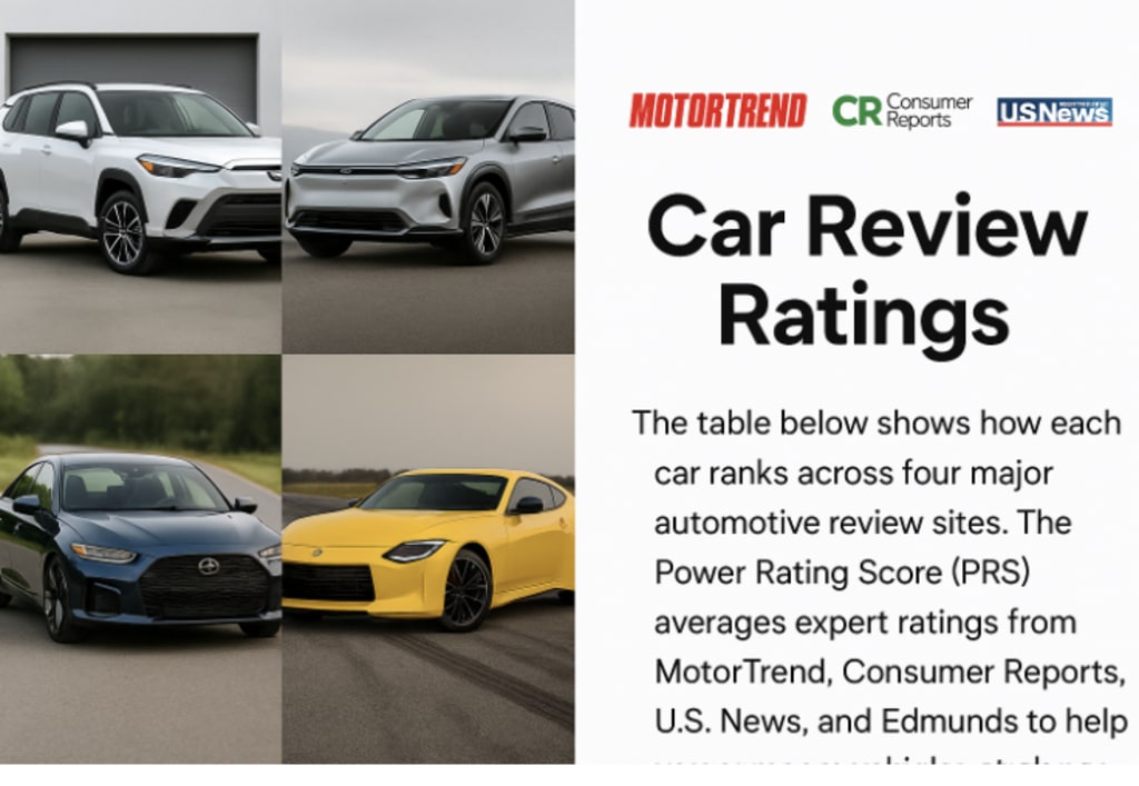 On my Car Review Ratings page, every vehicle pulls scores from four major outlets: MotorTrend, Consumer Reports, U.S. News, and Edmunds.