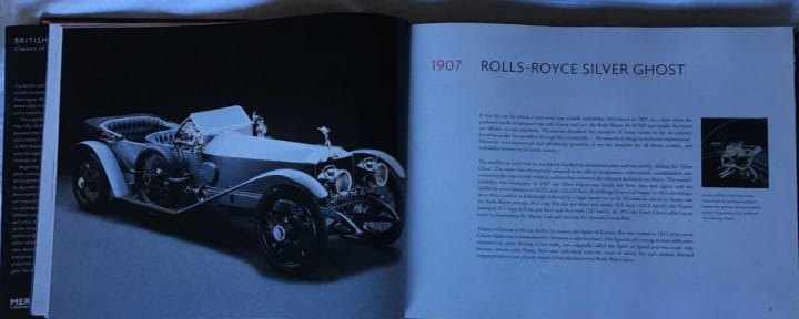 The chapters are organised in year order starting in 1907 with the stroy of how the Rolls Royce Silver Ghost came into being and how it was responsible for a new word entering the English language. 'Waftability' . In the Autocar review the journalist who wrote it described the six cylinder 40-50HP 7 litre engine as: