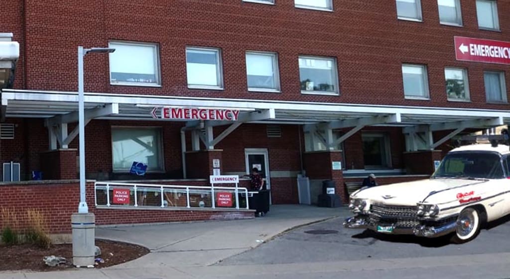 After finding a remote spot at the far end of the hospital parking lot, I slipped my ride into the only hole I could jam my car into. Then we headed towards the entranceway and finally into the overcrowded waiting room.