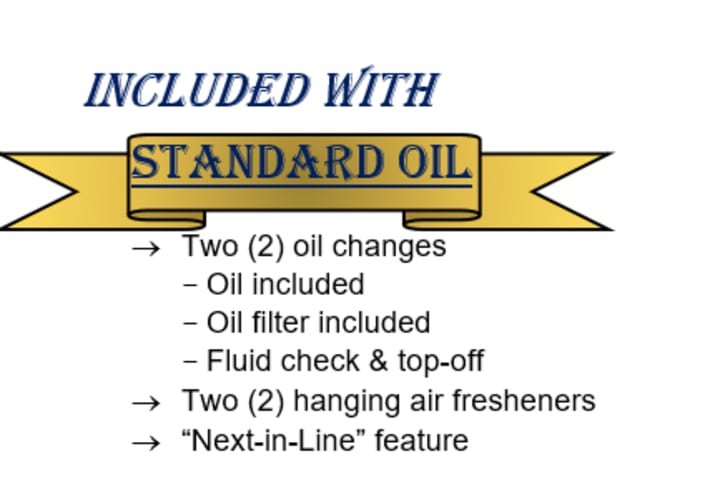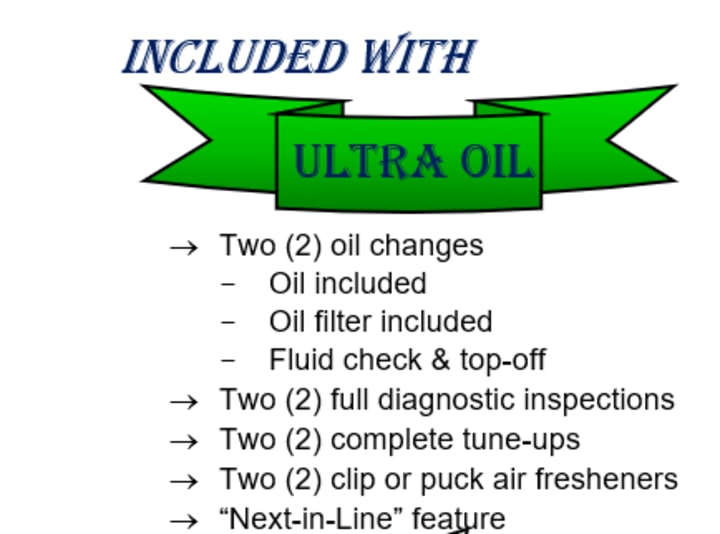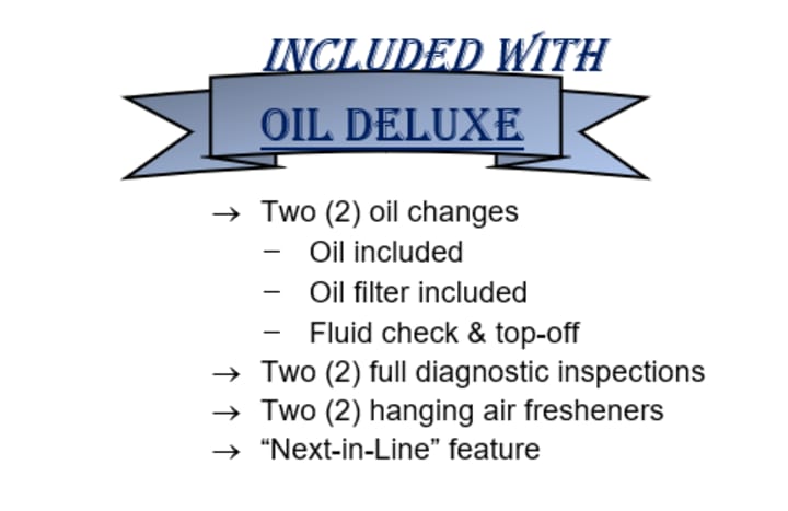 The result was three levels offered at three different price points. First, the Standard Oil level offers two oil changes, including the oil and oil filter, as well as a fluid check and top-off, as needed. In addition, two hanging air fresheners are offered with this package. Second, the Oil Deluxe service level provides the same features as the Standard level, but also includes two full diagnostic inspections. Finally, the Ultra Oil package includes all offerings from Oil Deluxe, plus two tune-ups and two clip or puck air fresheners.