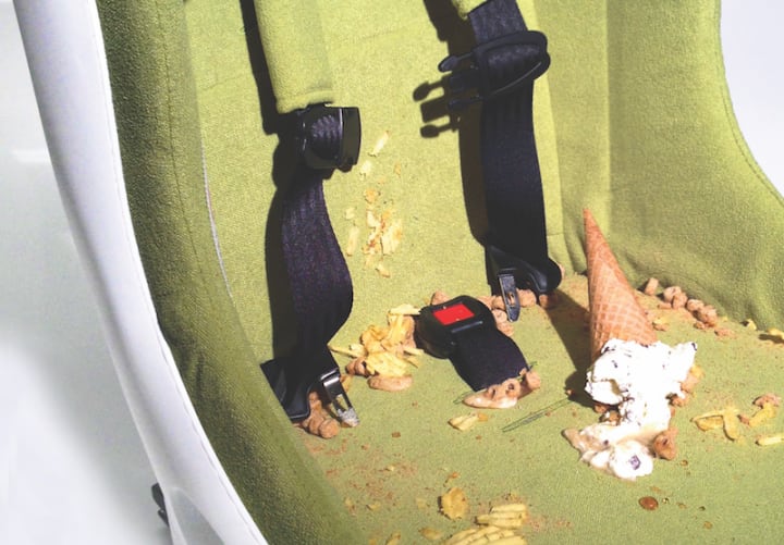 One of your first ideas may be the classic "no food in the car" rule. Banning your kids (and anyone else) from eating in your car is a great idea... in theory. In practice, it's rarely sustainable. Just wait until your next nine-hour road trip and see if you can still manage upholding that rule.