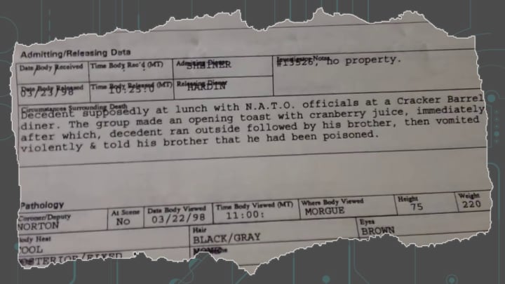Although most reports on the case refer to the Belgians as being investors, strangely Meyer's autopsy report refers to them as “NATO officials”… while a further twist to the meal that day was that the participants chose cranberry juice to toast the development of a research centre Vandemoortele was planning to establish after finalising the purchase of a plot of land in Grove City.