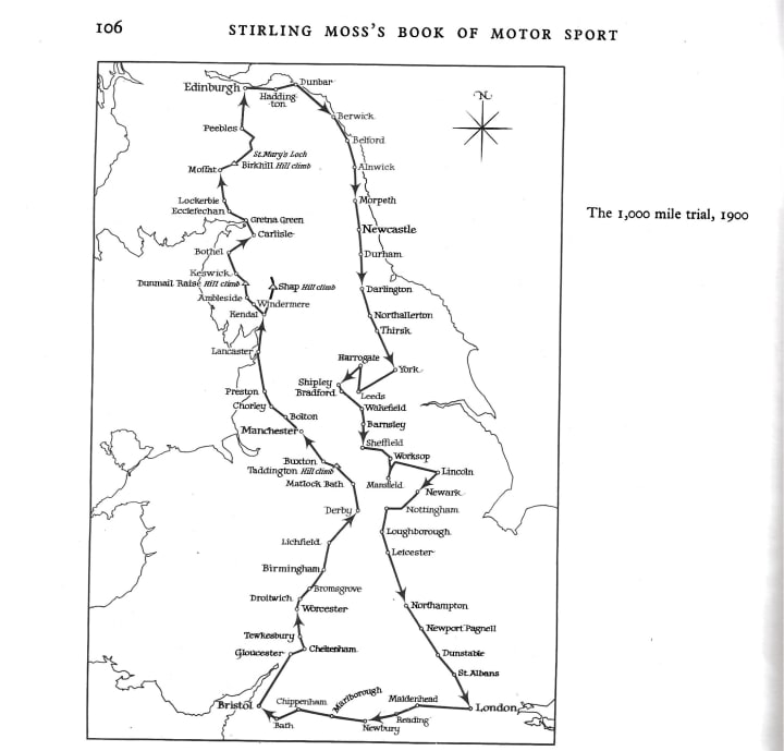 One of the earliest references t motorsport talks about a "1,000 mile trial" which took place in 1900. That was, according to some records, only 14 years after the first patent for a motor car was filed by Karl Benz who became the Benz in Mercedes Benz. The trial took competitors around Britain in a series 0f nearly seventy stages starting in London but going a far north as Edinburgh and finishing back in London on 12th May 1900.