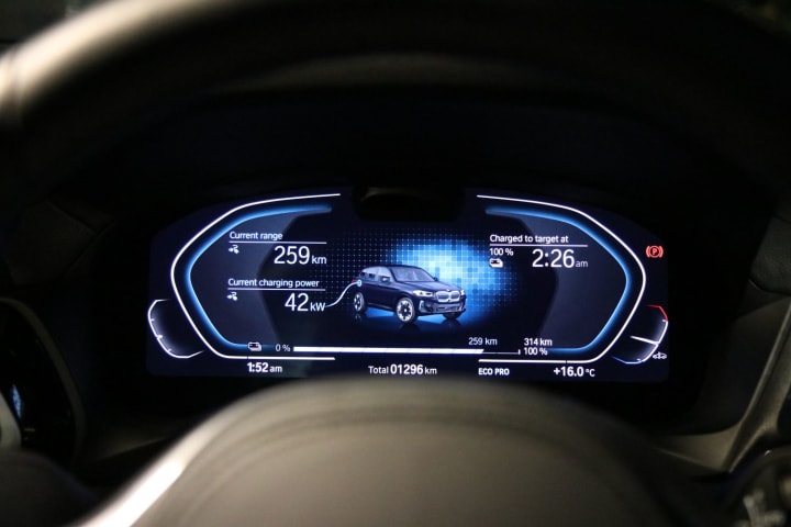 On a 150kW fast charger, the iX3’s battery can be charged from 10 to 80 per cent in little over half an hour. At home, with a BMW Wallbox charging station, 0 to 100 per cent battery can be reached in 7 hours and 30 minutes.