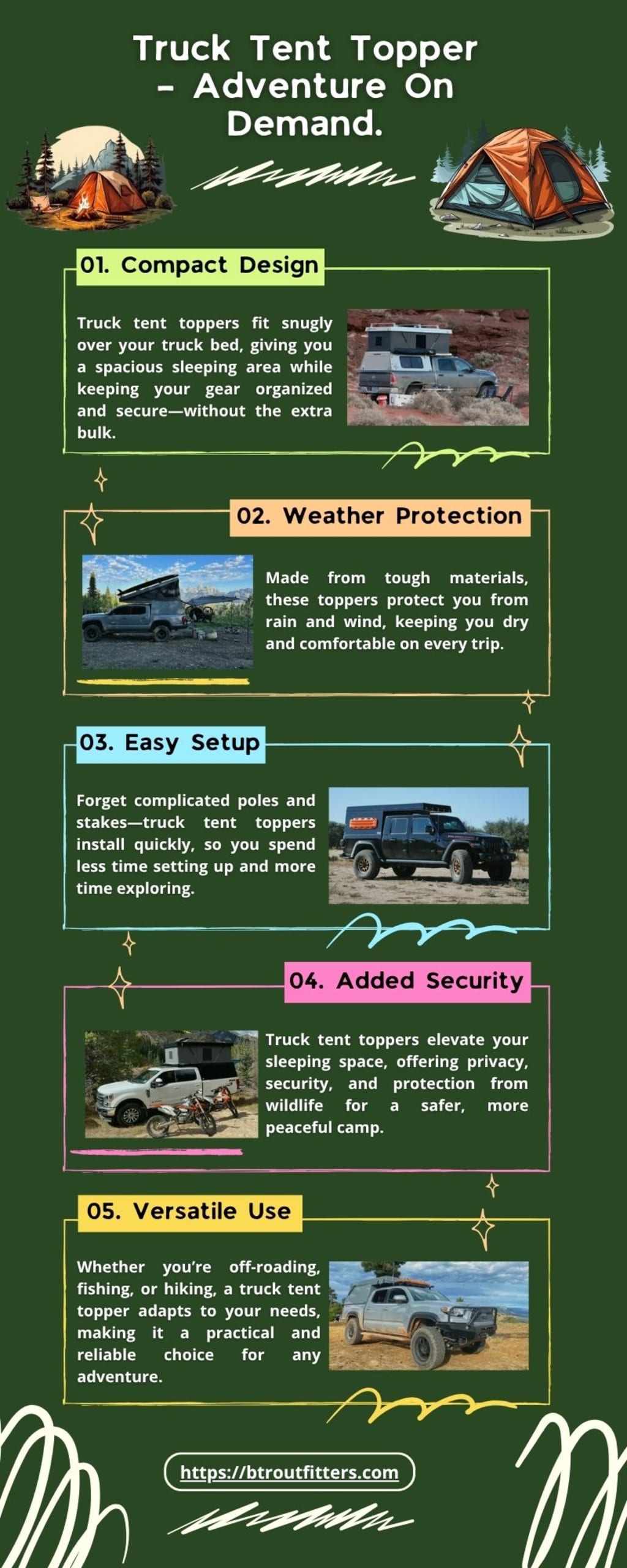 When it comes to combining comfort, convenience, and adventure, few solutions beat a truck bed tent camper. These innovative systems—often referred to as truck tent toppers—transform your vehicle’s truck bed into a versatile and secure basecamp for outdoor exploration. The recent infographic titled “Truck Tent Topper – Adventure On Demand” effectively breaks down the top five reasons these campers have become essential gear for outdoor enthusiasts. Here's a closer look at why truck tent toppers are your best adventure buddy.