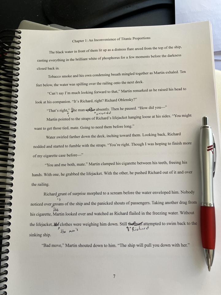 No matter how many times you’ve looked at your manuscript before, there’s no substitute to printing it out at Staples and going over it with a red pen. If you think I’m kidding: