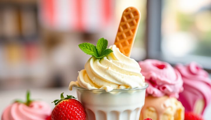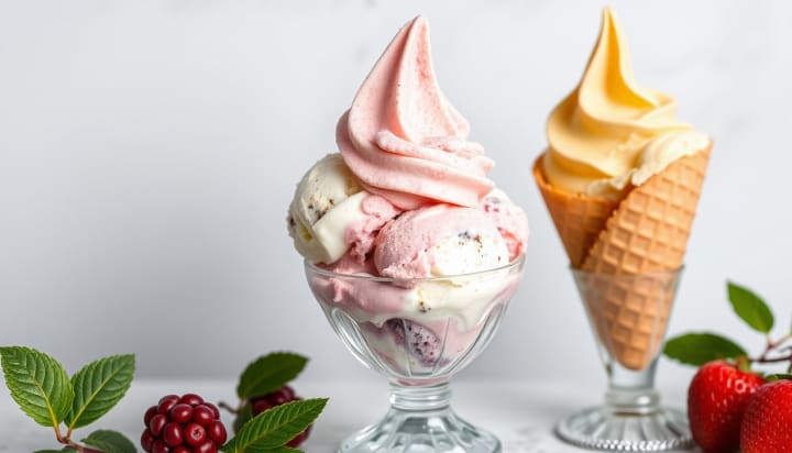 2. Italian Gelato: Known for its dense texture and intense flavor, gelato is churned with less air than traditional ice cream and contains less fat, resulting in a thicker consistency and concentrated taste.