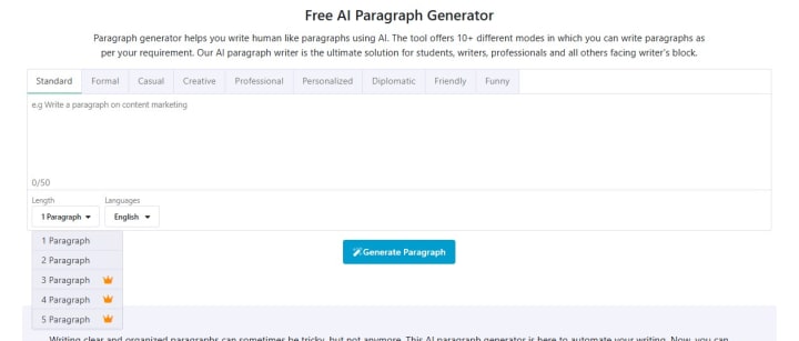 First of all, look at the red tick. Surprised? Yes you can work on generating blog text, emails, copywriting, essay and outline on one interface. This AI writer allows you to select the length of paragraphs as well.