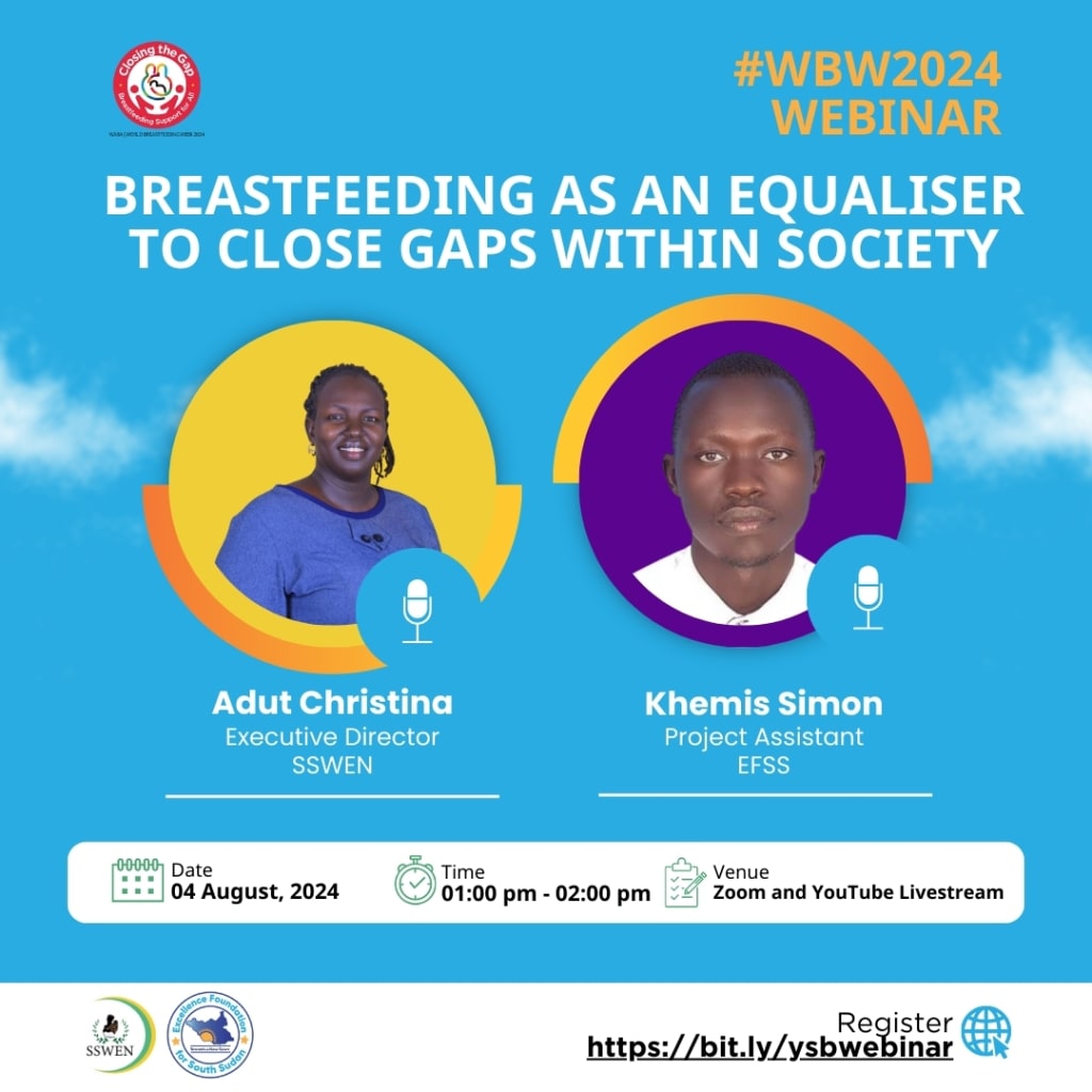 On Sunday, 4th August 2024 from 1 p.m. to 2.30 p.m. Juba Time (GMT +2), the Excellence Foundation for South Sudan (EFSS) and South Sudan Women Empowerment Network (SSWEN) held a webinar to mark the breastfeeding week under the theme “BREASTFEEDING AS AN EQUALISER TO CLOSE GAPS WITHIN SOCIETY.”
