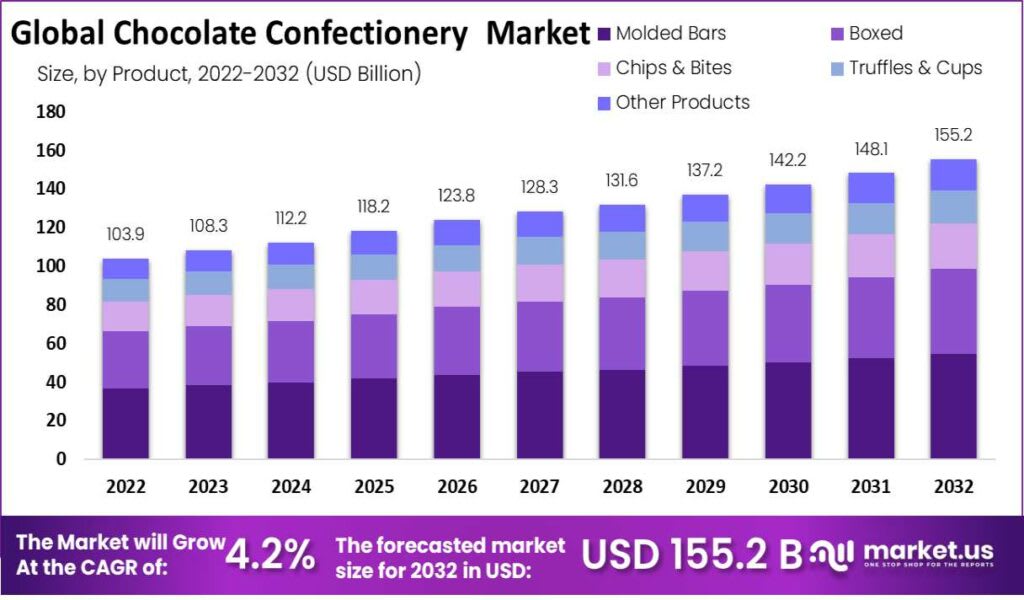 Global Chocolate Confectionery market accounted for USD 103.9 billion and is expected to reach USD 155.2 billion in 2032. This market is estimated to register a CAGR of 4.2%