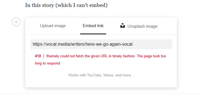 In this story (which I can't embed), Raymond G. Taylor remarks that when this happens to readers, they don't wait or retry, and we lose reads. If we are paying for our subscription, Vocal should be offering some recompense for that.