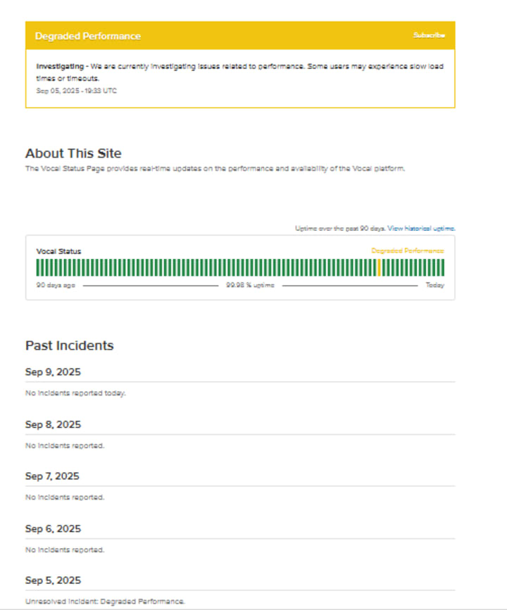 Not a word from Vocal. This is what their status page is showing. Disruption last Friday, but everything has been fine since then: