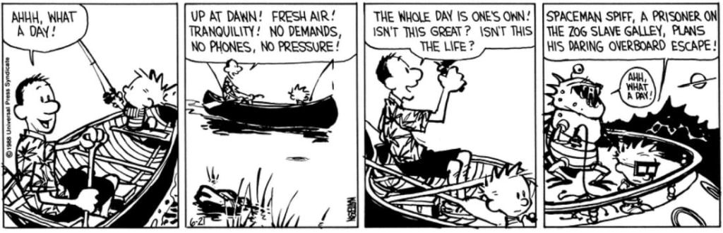 (Dad continues rowing, while Calvin sits disinterestedly in the boat.)