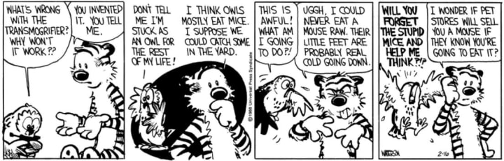 Calvin: "DON'T TELL ME I'M STUCK AS AN OWL FOR THE REST OF MY LIFE!"