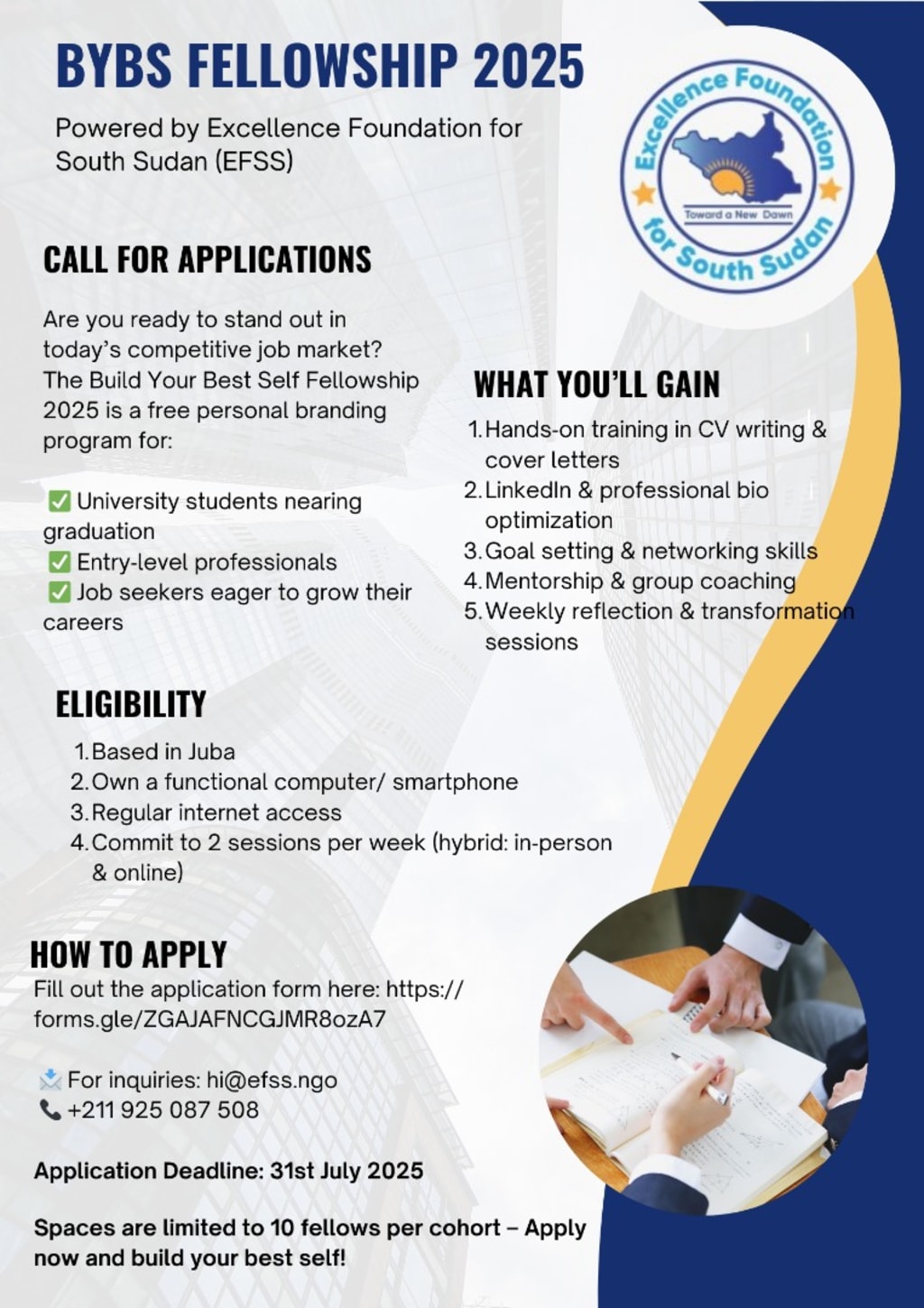 Juba, South Sudan – July 2025 — The Excellence Foundation for South Sudan (EFSS) has announced the launch of the Build Your Best Self Fellowship 2025, a career readiness initiative aimed at empowering final-year university students, recent graduates, and entry-level professionals in Juba with the skills and confidence to navigate the modern job market.