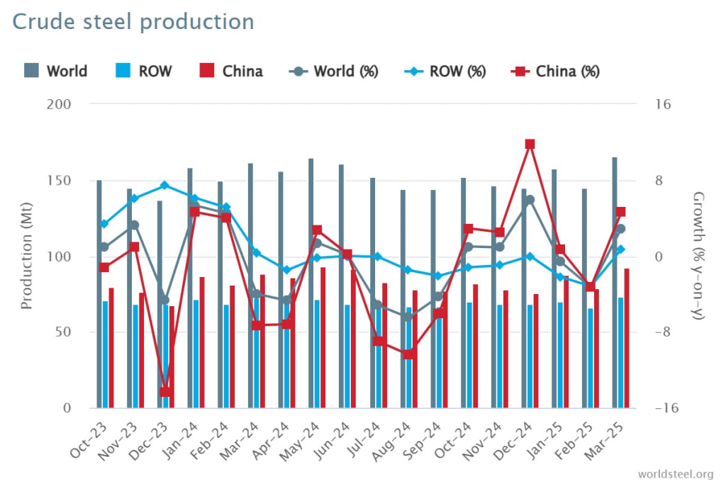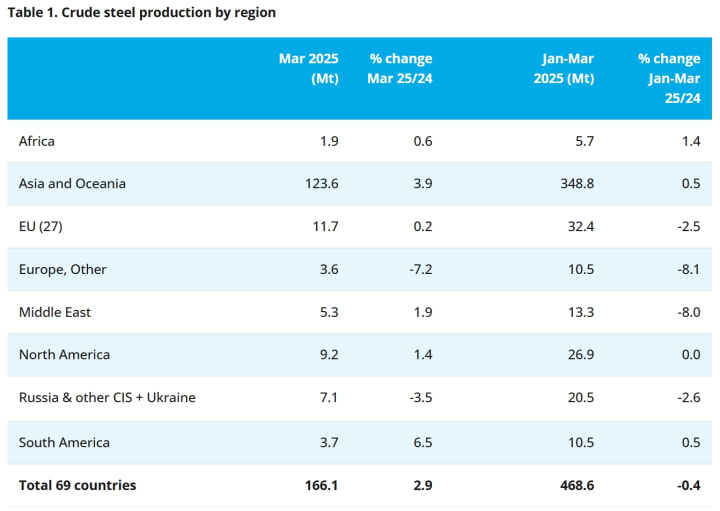 World crude steel production for the 69 countries reporting to the World Steel Association (worldsteel) was 166.1 million tonnes (Mt) in March 2025, a 2.9% increase compared to March 2024.