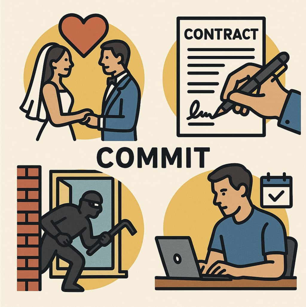 - pledge or bind (a person or an organization) to a certain course or policy, as in "to be dedicated/committed to peace"; "pledge or set aside/commit (resources) for future use"; or "be in a long-term/committed emotional relationship with (someone)."