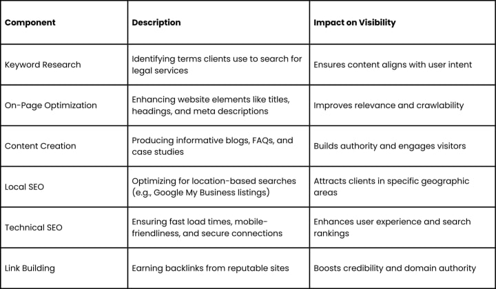 SEO is a multifaceted discipline that requires a strategic approach. Below are the core components that law firms must address to maximize their online visibility: