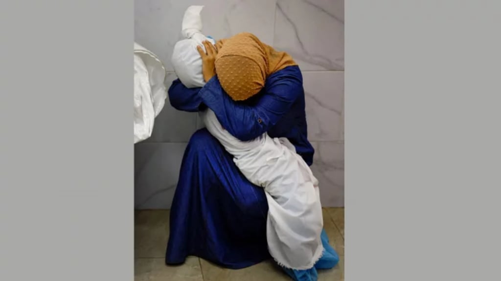 A Palestinian lady bowing in a medical clinic funeral home holds the body of a kid enveloped by a cover in her arms and cries. The photograph of this strong scene has been chosen as the '2024 World Press Photograph of the Year'.