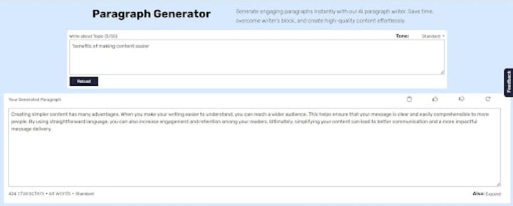 It provides the paragraph in easy words, which was too helpful for me for starting my content. It was totally free of plagiarism and AI. I would recommend you to try this tool if you are totally blank and don’t know where to start your writing from.