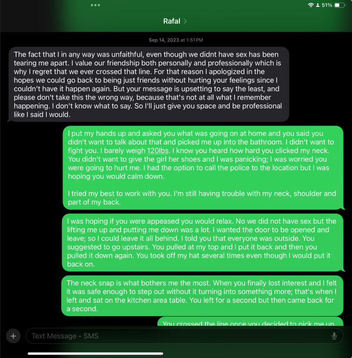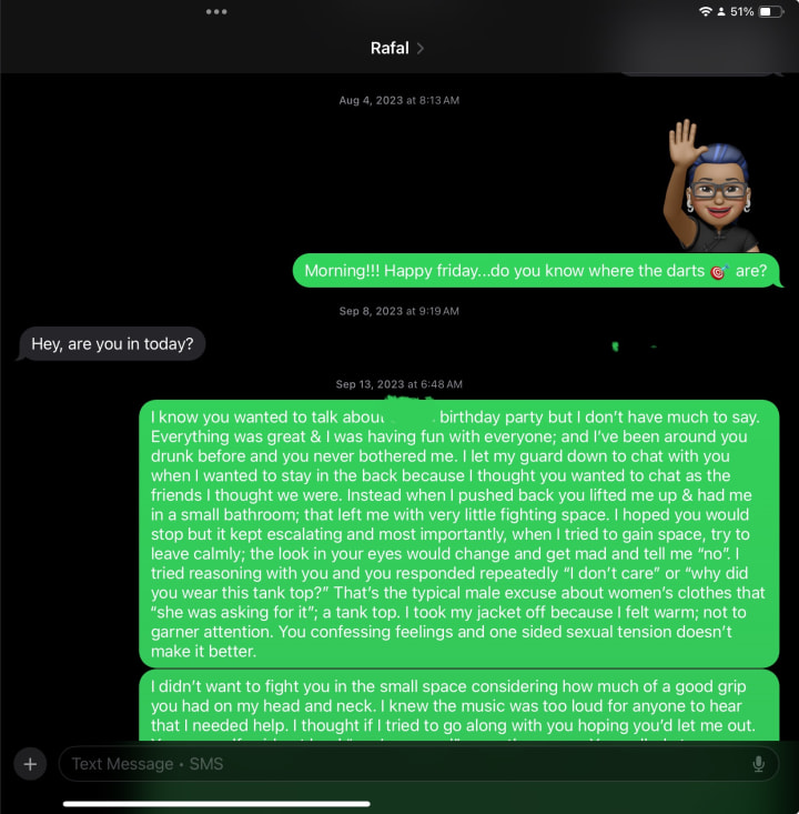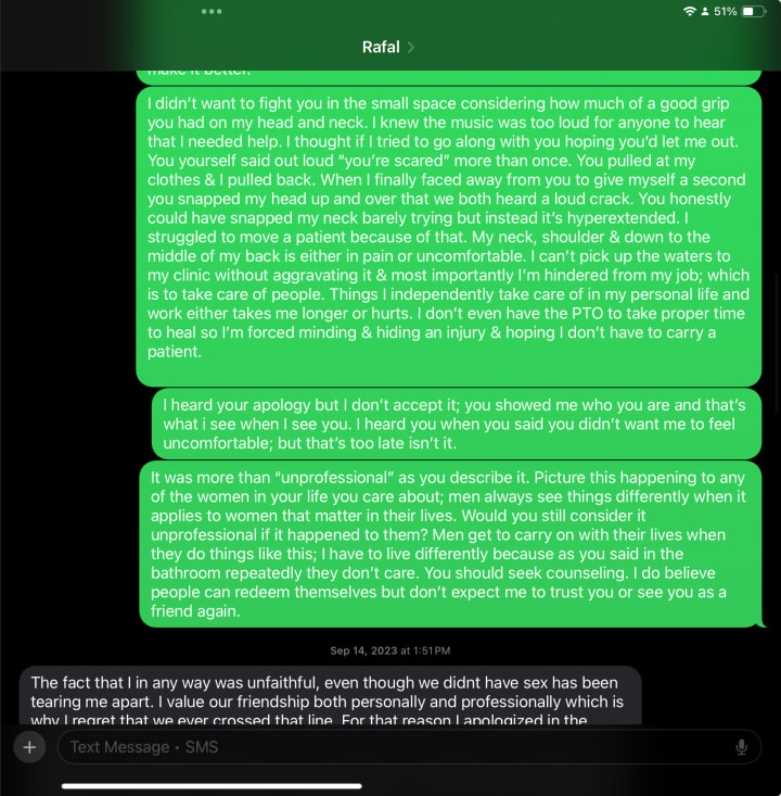 “Hey, can you come here for a second?” His voice was casual and familiar. I did not feel like chatting about whatever personal questions they had but I had no reason to say no or any reason to suspect anything; this is a point of my life I was learning to relax for once. I had 2 protectors distracted and basking in their laughter; I was only a few feet away from them. So I followed Rafal to a more isolated area literally 10 feet away but visible, where the lights didn’t reach as well. He had no more than two drinks (I would know because I was their emt & was watching over everyone) and said he had to pee; ok. I had my eyes on the group and smiling to everyone else and happy to my friend having a wonderful birthday. Music blaring just a few feet in front of me. The speaker would be next to the wall of where the bathroom is. I wanted to join again and began to walk towards the group but he moved fast when my back was facing him; it was faster than I expected for a man his size with the intent he had in mind. One second I was upright, the next, I wasn’t. His hands were on my neck and I realized my head was as close to the ceiling as if I was 6’4: I’m 5‘7”. The stretching of my neck hurt immediately.
