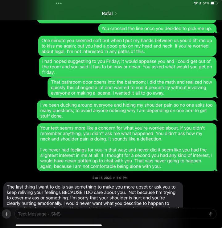 People around me went on like nothing had happened as best as they could but I was the elephant in the room especially when his boss buddy would work up my “reputation” to protect Rafal’s; I expected it of her cause you know everyone supports women right.