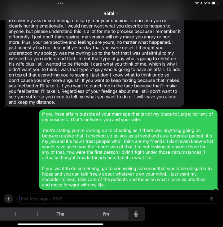 The funny unfunny part is he showed up to my clinic to tell me he thinks we should keep it between us because I didn’t answer his text messages; I was too injured to fight but it didn’t stop me from reaching for the scissors. In my clinic I had tools and space. “We shouldn’t tell anyone about this”. I blew up.